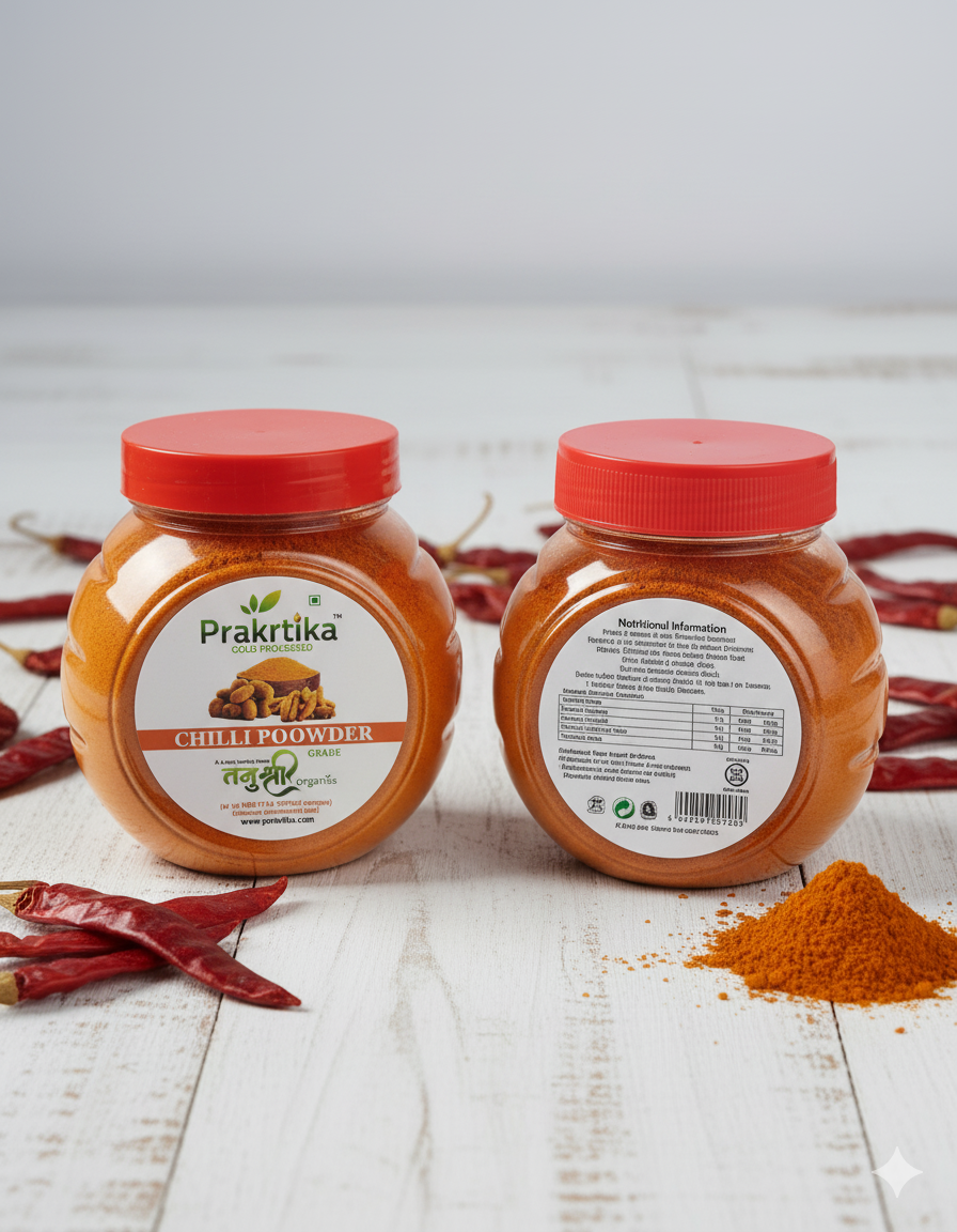 Turn up the heat and invigorate your dishes with the bold and powerful Prakritika Chilli Powder. Crafted from premium organic sun-dried chillies, this spice delivers a deep, robust red color along with the intense flavor and heat that Indian cuisine is known for. Its natural components promote cardiovascular health, aid in digestion, and enhance immunity with antioxidant properties. Whether for sizzling curries, spicy chutneys, or tangy marinades, this chili powder adds essential zest and warmth. With no artificial color or preservatives, it offers a pure and vibrant taste that respects tradition and embraces flavor. Prakritika Chilli Powder is your go-to spice for authentic heat and healthful dining experiences.